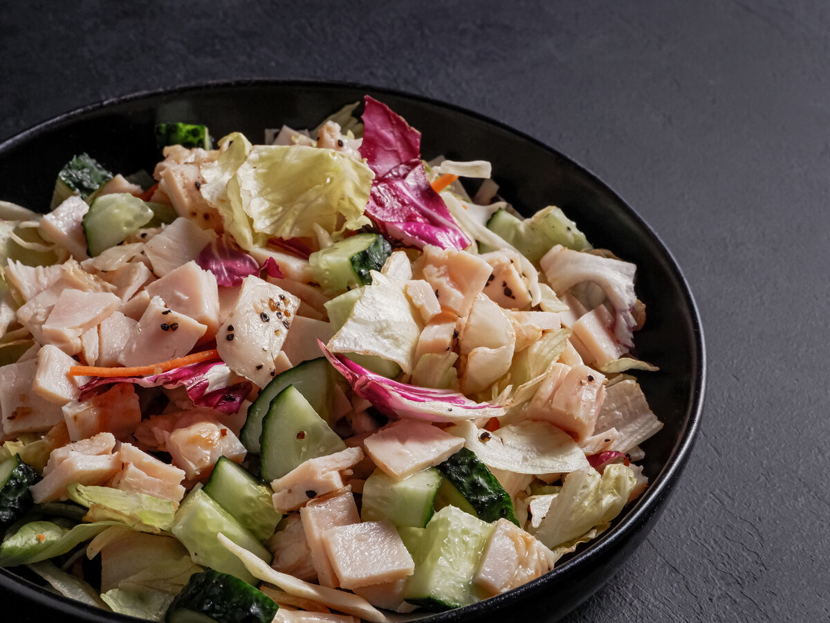 Вот такой красочный салатик у меня получился: здесь микс овощей, курица, огурцы и заправка.