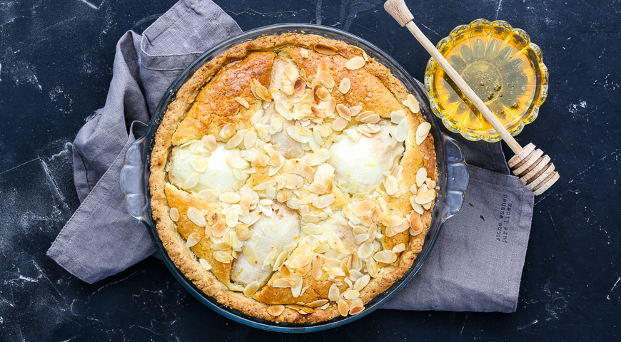 Песочный пирог с грушами Замороженное песочное тесто для пирога выложите из упаковки и разложите пласты на рабочем столе в один слой. Дать полностью оттаять при комнатной температуре. Оттаявшее тесто для пирога раскатайте в прямоугольный пласт толщиной 5-7 мм. Переложите его в форму размером примерно 18х28 см, выстланную бумагой для выпечки Сформируйте бортики. Если будут излишки теста, обрежьте их. Основу песочного теста для пирога в форме часто наколите вилкой. Уберите в холодильник на 30 минут. Охлажденную основу теста выстелите бумагой для выпечки. Сверху насыпьте любые сухие бобовые слоем 1,5-2 см. Духовку нагрейте до 200°C. Выпекайте основу пирога 15 минут. Бумагу с бобовыми удалите. Основу пирога верните в духовку ещё на 7-10 минут. Подготовьте груши для начинки. Вымойте их и разрежьте на половинки. Удалите сердцевины с семенами. Сбрызните груши изнутри лимонным соком, посыпьте цедрой. Мягкое сливочное масло взбейте миксером с сахарной пудрой. Не прекращая взбивания, по одному