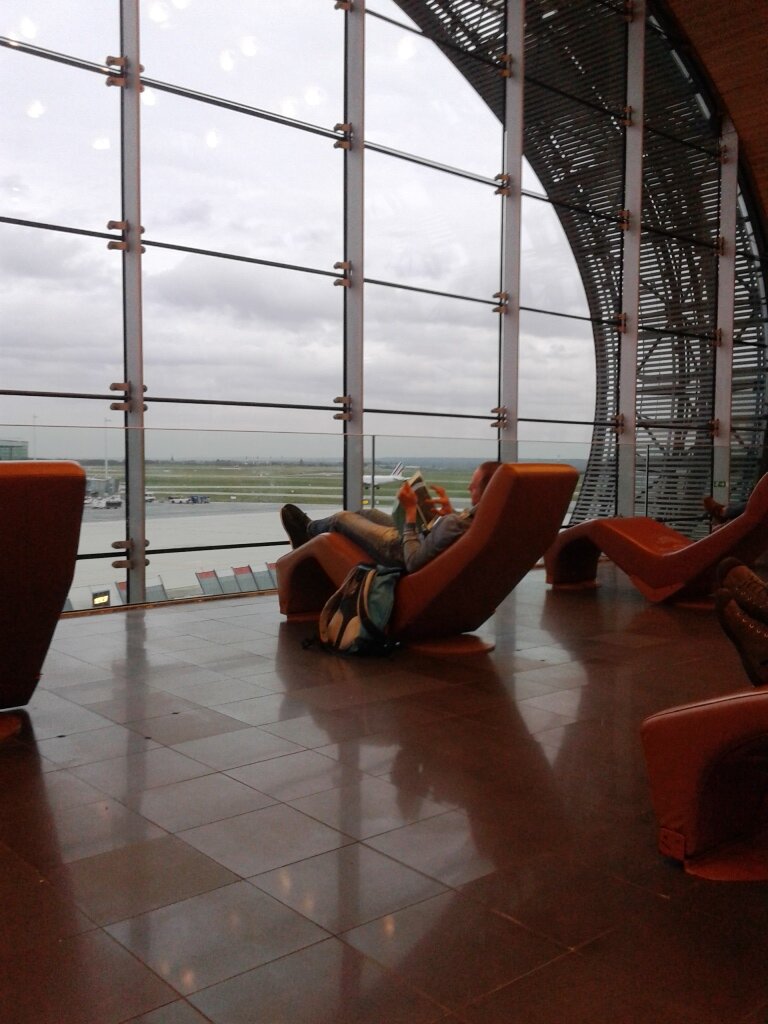 В Париже у нас была пересадка около 6 часов. Сначала мы хотели выехать в город, благо виза уже была. Но, оказалось, шесть часов пересадки не так уж и много. Пока порулили на посадке, пока не спеша прошли контроль и перешли в другой терминал, прошлись по магазинчикам. Терминал был огромный и было огромное количество кресел (в отличие от Шереметьево). А самое интересное мы обнаружили в торце терминала: «релакс зону», которая состояла из очень комфортных кресел-полулежанок с видом на взлетную полосу.