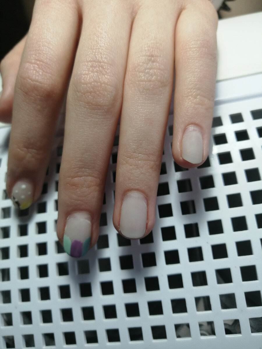 Добрый день, мои дорогие читатели! Сегодня покажу работу на моей подруге, которая немного затянула с коррекцией, поковыряла кутикулу, но не критично 😌 Вот с такими ручками она ко мне пришла: Немного отслоек, но, в целом, все ногти на месте! За исключением лишь большого пальца, который решил нарушить сию гармонию 😂 Впрочем, как всегда. Зачастую получается, что именно с ним возникают проблемы, по истечении срока ношения гель лака. Сейчас все исправим! Я сняла покрытие и сделала на ногтях маникюр. Затем салфеткой с обезжиривателем обработала ногти, убрала всю пыль, которая оседает под кутикулой и на пальцах После чего наношу бескислотный праймер и даю ему время подсохнуть. Праймер сохнет, в среднем, около минуты. Не старайтесь на мокрый праймер сверху сразу наплюхать базы - он не будет выполнять свою главную функцию, а именно сцеплять ноготь с базой. После того как праймер подсох, наношу на все ногти тонкий втирающий слой базы и сушу в лампе. Так как девушка захотела полупрозра