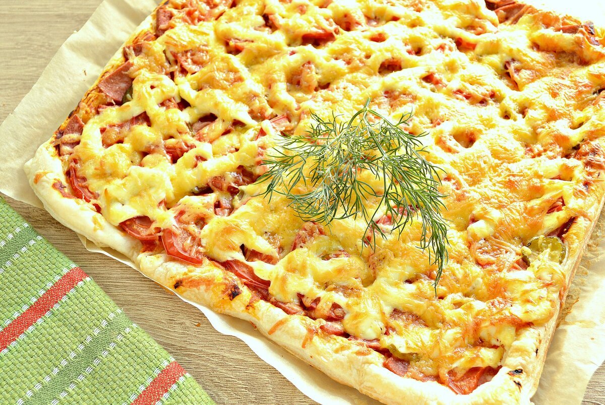 Всем привет, Вы на канале с лучшими рецептами! Сегодня предлагаю вам рецепт очень вкусной и быстрой пиццы из слоеного теста. Сразу скажу, что начинка может быть любой, на ваш вкус. Я предлагаю классическую начинку с колбасой и солеными огурцами. Итак, давайте посмотрим, что нам сегодня понадобится для приготовления. Нам нужно совсем немного, и начнем с того, что нарежем маринованные огурцы тонкими пластиками, дальше натрем сыр на крупной терке (можно использовать любой какой вам нравится). Я люблю в пиццу добавлять также моцареллу, либо сыр сулугуни. И теперь нам с вами осталось сделать томатный соус для пиццы, который очень просто делается. Для этого смешиваем томатную пасту, любой ваш любимый кетчуп и немного воды, чтобы соус был сочнее. Сюда же добавляем соль и перец, а также сушеный базилик и смешиваем все это до однородности. Из приготовлений на этом все. Берём слоёное тесто и начинаем делать пиццу. Тесто немного раскатаем от середины к краям, выкладываем его на противень, присыпа