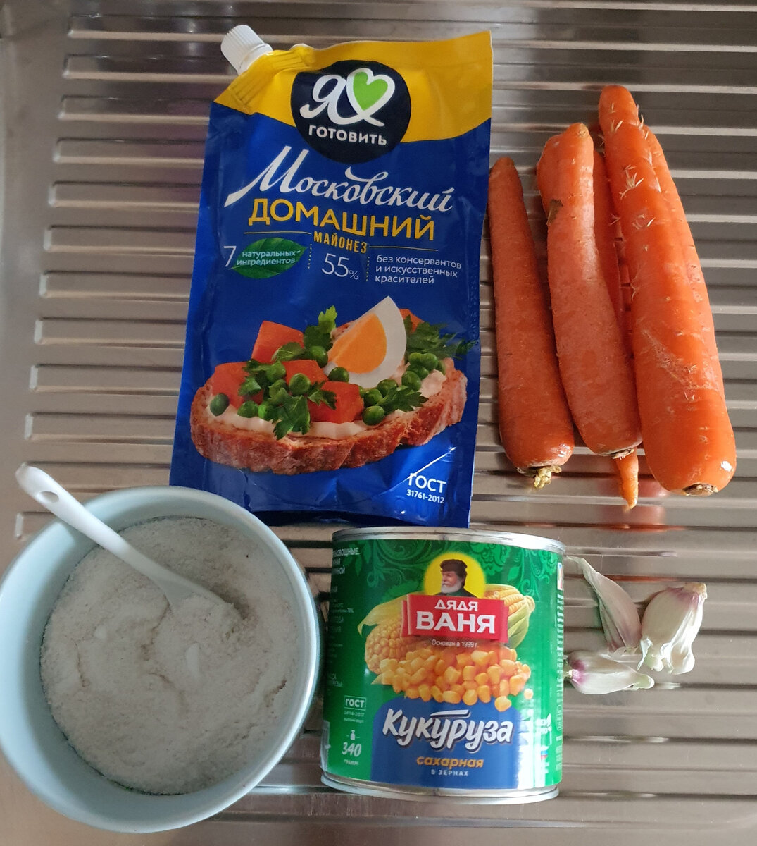 Это не салат, а настоящая палочка-выручалочка. Готовится просто и максимально быстро. Ингредиентов минимум, удовольствия максимум! Салат имеет приятную сладость, получается хрустящим и сочным, а чеснок придаёт закуске приятный аромат и остроту. Ингредиенты: - морковь 150 грамм - кукуруза консервированная 150 грамм - чеснок 2 зубчика - майонез и соль по вкусу С консервированной кукурузы слейте жидкость. Сырую морковь очистите и натрите на крупной тёрке. Чеснок очистить и мелко нарезать ножом или пропустить через пресс. В миске соедините все ингредиенты салата. Тщательно перемешайте. Приятного аппетита!