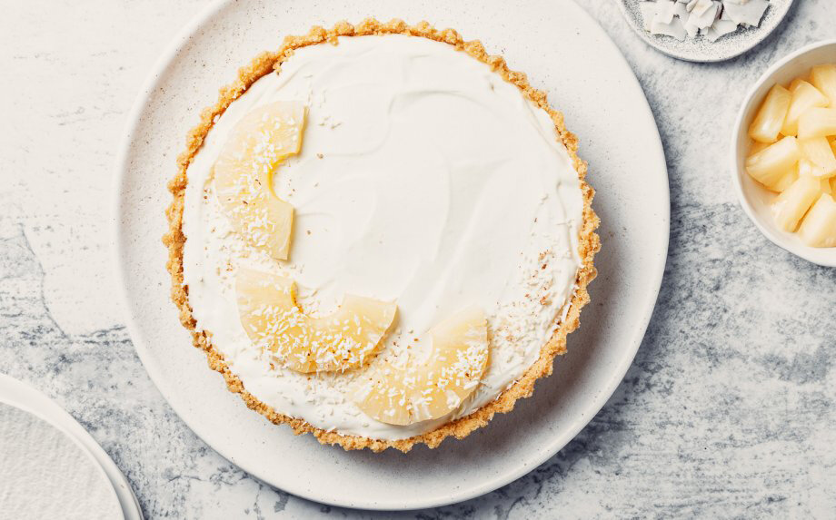Очень вкусный и очень быстрый торт, который очень красиво смотрится на столе, и его легче приготовить. На приготовление уходит минут 30-40, иногда быстрее ИНГРЕДИЕНТЫ: ОСНОВА: 1-230 грамм печенье (я использовал Gaidelis classic) 2-100 грамм масло 3-КРЕМОВЫЙ ЦВЕТ: 250 грамм сыр маскарпоне 4-250 грамм сливки, 35% жирности 5-200 миллилитров кокосовое молоко (я использовала 18% жирности, можно заменить греческим йогуртом, см. советы) 5-1 банка консервированный ананас (поменьше, нарезанный кубиками, вес нетто около 350 г) 6-100 грамм сахар (или по вкусу) 7-3 ст. лимонный сок 8-12 грамм желатин СПОСОБ ПРИГОТОВЛЕНИЯ: 1. Влейте в желатин около 100 мл кокосового молока и оставьте набухать на 15-20 минут.