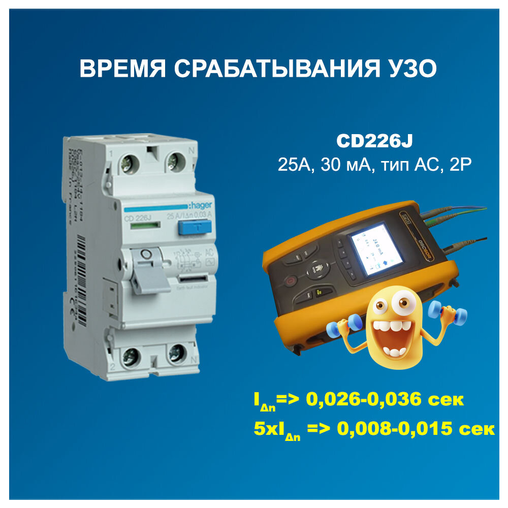 Устройство, соответствующее ГОСТ, должно срабатывать за: Вывод: УЗО Hager CD226J по времени срабатывания соответствует ГОСТ с хорошим запасом прочности.