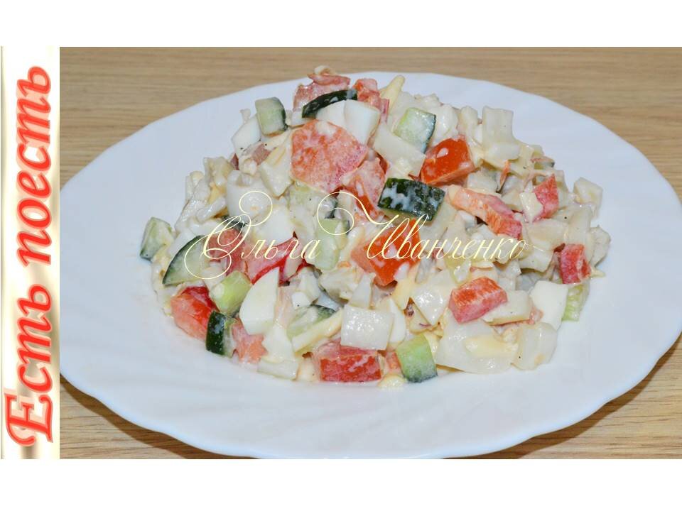 Лёгкий вкусный салатик с кальмарами, овощами и сыром готовится достаточно быстро, времени для пропитки ему не требуется. Вместо майонеза добавляется заправка на основе сметаны или йогурта, но можно использовать и сам майонез.
