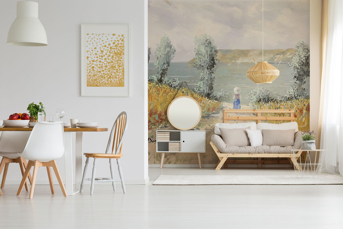 - Природный колорит. В интерьере нет места ярким расцветкам и кричащим контрастам. Он впитал в себя природные цвета Юга Франции: голубые тона неба и моря, золотисто-бежевые оттенки песка, приглушенную зелень спелых оливок и розово-фиолетовую дымку над цветущими полями лаванды. Все эти цвета органично сочетаются друг с другом и никогда не надоедают. Производители интерьерного декора предлагают множество разновидностей обоев, а также фрески прованс, выполненные в этой цветовой гамме.