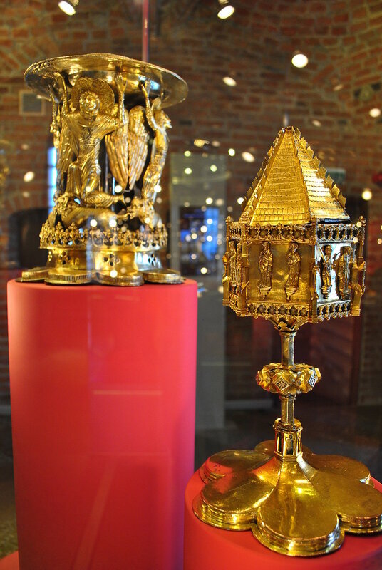 Кубки, кресты, оклады, Евангелие и прочее, прочее. Качество и красота производят впечатление, насколько тонкая работа и это при том что это 17-18й века. Можно часами рассматривать!!! Не отрываясь…