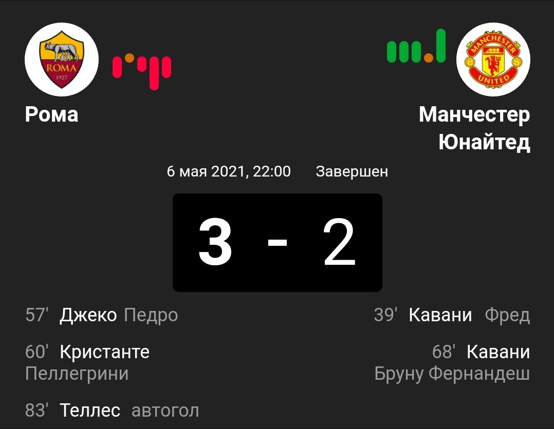 Римляни принимают МЮ в ответном матче. Юнайдет разгромил Рому у себя дома со счётом 6:2. Теперь хозяем нужно не мало попотеть, чтобы пробиться в финал. На 39-ой минуте Уругвайский Монстр он же Кавани пробивает Римлян мощнейший ударом, казалось бы положение вне игры, но нет гол засчитан. Дело шло к 57-ой минуте, ничего не предсказывает беды, виликолепный Педро лупит с лету по мячу и тут Джеко подставляет свою головень под мячик тем самым оформляя голешник гостям. Полузащитник Дьяволов под именем Фред дарит возможность реализовать гол хозяем, Кристанте на упускает эту возможность ударив с разворота, Де Хеа был беззащитен. Бруну отдаёт гениальный пас Эдинсону в штрафную Римлян тем самым Кавани оформляет дубль. Не повезло Де Хеа на 83-ей минуте пропускает обидный рикошет, конечно тут постарался Польский нападающий Ромы. Хозяевы хорошо бились, но это было не достаточно для финалиста, Манчестер Юнайтед в финале!