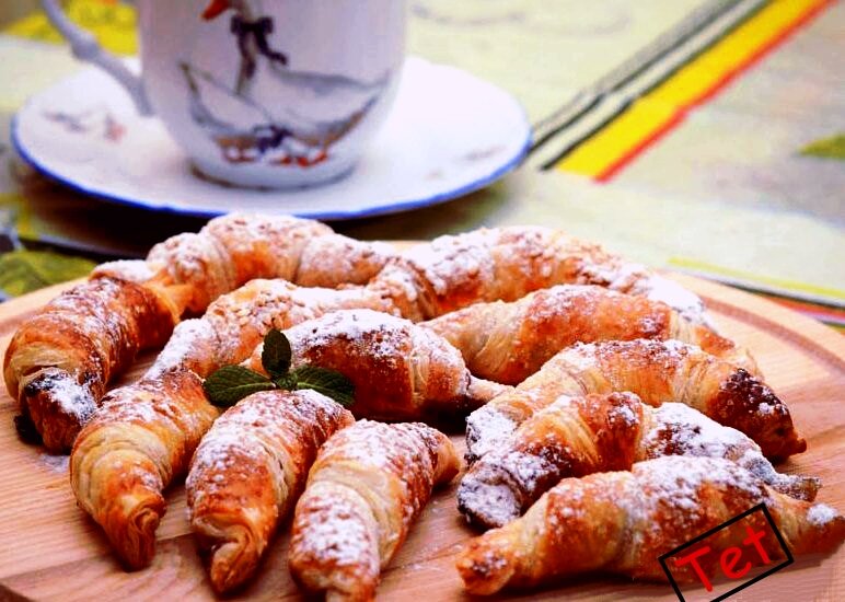 Круассаны из слоеного теста - одна из самых быстрых сладких закусок. Это рецепт, который готовится очень быстро. Круассаны получаются красивыми, ароматными и супер вкусными. Ингредиенты: слоеное тесто – 1 лист (375 г); нутелла, шоколад, густое варенье и т. п. - 75 г; для присыпки: сахарная пудра. Процесс приготовления круассанов из слоеного теста. Раскатайте полоску теста, чтобы она стала еще тоньше. Острым ножом нарезать 7 треугольников. Вы можете отделить треугольники друг от друга и дополнительно немного их раскатать, чтобы круассан имел больше завитков. На каждый треугольник выложите небольшую чайную ложку начинки. Разложите сладкую начинку, как показано на фото ниже. Раскатайте круассаны, от широкого места к тонкому кончику. После раскатки поднесите оба конца круассана ближе друг к другу и заправьте тонкий кончик под дно круассана. Не оставляйте тонкий кончик теста этаж круассана, так как он будет скатываться и торчать во время выпекания. Таким образом приготовьте все круасса