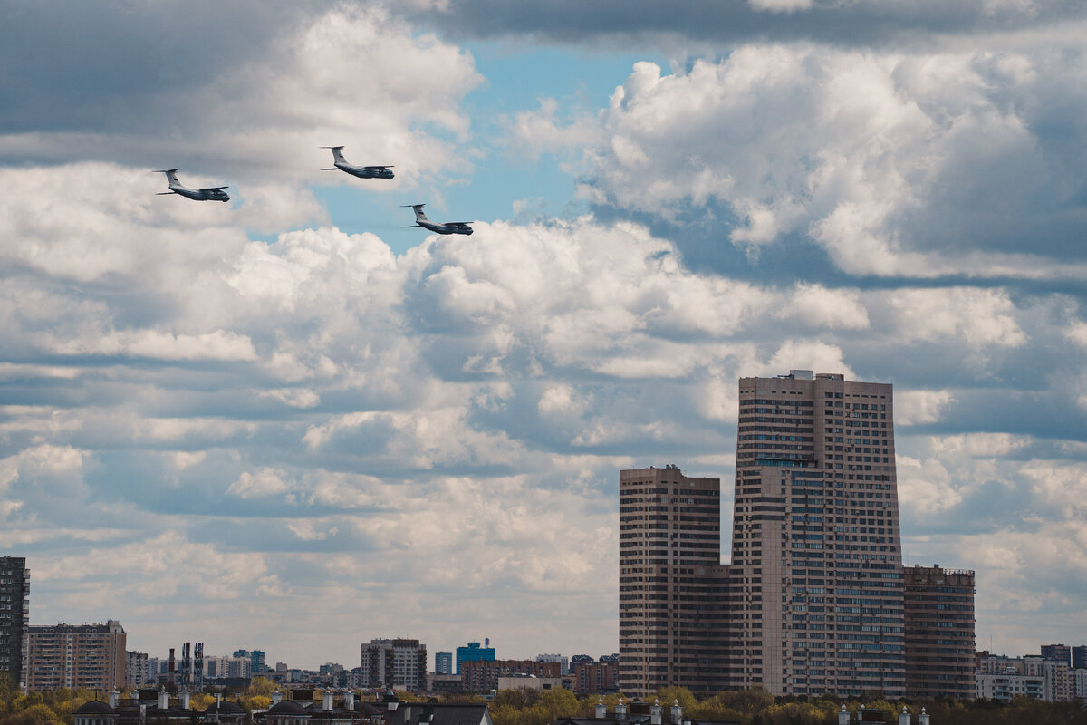 А когда выглядывают люди в окно – картина не менее устрашающая, чем звук. Дело в том, что тут во всю репитируют парад на 9-е мая. И, если наземная часть выражается в перекрытиях и пробках, но более менее тихо (страдают только прилегающие дома), то авиация без грохота не умеет.
