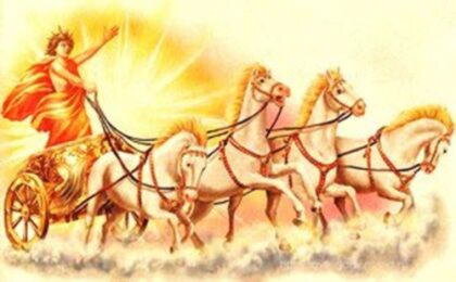 Фаэтон - по древнегреческой легенде, сын бога Гелиоса-Солнца, который на своей колеснице едет по небесному своду, освещая Землю и дарит солнечный свет всему живому. И только Гелиос мог справиться со своими резвыми конями и управлять колесницей Солнца. Но как-то случилось нежданное: сын Гелиоса Фаэтон выпросил у своего отца Гелиоса позволение править солнечной колесницей, но его упряжка погубила его: кони неумелого возницы отклонились от правильного направления и приблизились к Земле, отчего та загорелась. Гея-Земля взмолилась к Зевсу, и тот сразил Фаэтона молнией, и Фаэтон рухнул в Эридан и погиб. Сестры Фаэтона, гелиады, оплакивавшие своего брата на берегах Эридана, были обращены в тополя, а их слезы — в янтарь. Его позолоченная колесница хранилась в Коринфе. Мифы о падения Фаэтона связаны с мифами о Всемирном потопе и падении планеты Фаэтон, орбита которой проходила между Марсом и Юпитером, и была разрушена вследствие какой-то катастрофы. У многих народом по всей Земле были подобны