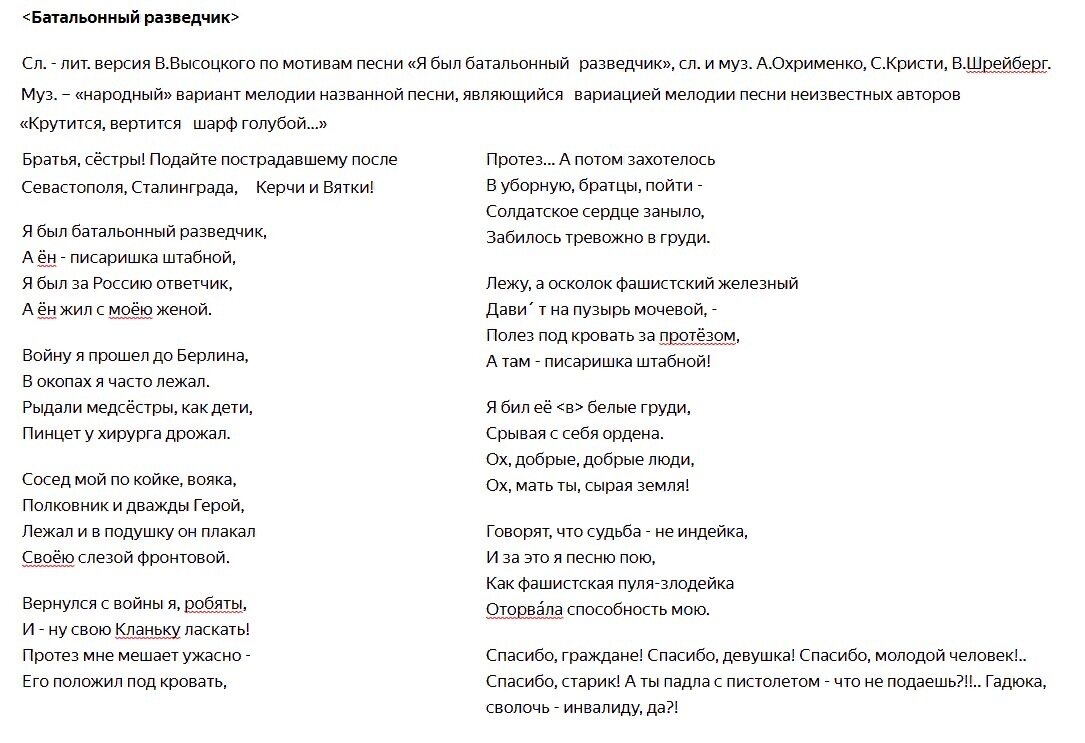 А между тем, песня эта для Высоцкого в чем-то программная. Выросший во дворах и на улицах послевоенной Москвы, Володя с детства слышал рассказы о войне, видел этих инвалидов, слышал эти горькие, грубые, иногда полублатные песни. Это не было чем-то чуждым и наигранным для него. Тот же Г. Полока рассказывал, как потрясен был Папанов, сам фронтовик, тем, насколько точно Высоцкий передавал в этой песне интонации, настроение и дух того времени.
