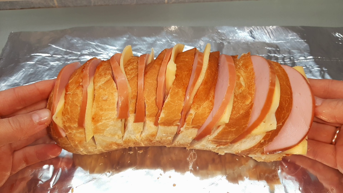 Всем привет, друзья! Сегодня готовлю очень простое и вкусное блюдо для перекуса. Очень удобно брать с собой в дорогу или на пикник. Таким аппетитным батоном можно накормить целую компанию. Отличная закуска для разных случаев. Рецепт: Багет - половина. Колбаса варёная - 150 гр. Сыр - 150 гр. Кетчуп - 3 ст.л. СПОСОБ ПРИГОТОВЛЕНИЯ: Итак, для начала нарезаю батон, но не до конца, оставляю снизу примерно 1 см. Получается вот такая гармошка. Кладу батон на фольгу. Смазываю кетчупом каждый разрез по половине чайной ложки. В каждый разрез кладу ломтик сыра. На сыр кладу ломтики варёной колбасы. Заворачиваю батон в фольгу, закрепляю края и убираю в духовку на 15 минут при 180 гр. Вот и всё: разворачиваем фольгу и наслаждаемся вкусными и аппетитными бутербродами. С начинками можно эксперментировать, добавить зелень, чеснок, копчёности и т.д. Желаю всем приятного аппетита и отличного настроения! Буду очень рада вашей подписке на канал и отзывам в комментариях!