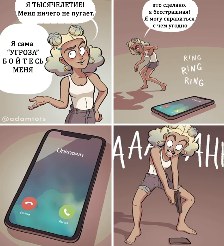 Привет мои хорошие. Уже давно не было комиксов от Адама, поэтому я хочу вам предоставить новую подборку с его комиксов, которые я переводил специально для вас. Также, если вы хотите видеть комиксы в оригинале и без задержек, то вам нужно посетить Инстаграм автора. Сегодня вы увидите истории девушек и их жизненные приключения, которые многим кому будут как родные, например: когда звонит неизвестный номер, когда мы что-то смотрим в тайне от всех и много чего другого. 1. Неизвестный абонент 2. Старая закалка 3. Когда твой парень не так всё понял 4. Когда ты не в теме 5. Иногда хочется побесится 6. Секретик Патреон Адама Ну а на этом у меня всё, если вам понравилась данная подборка и вы заметили что-то знакомое для вас, тогда можете поделиться об этом в комментариях. Также можете писать всё что думаете о данной публикации в комментариях. Присоединяйтесь в наш чат Читайте также ✅ После этого комикса парни и девушки ловят флэшбэки. Подборки из серий "жиза" #2