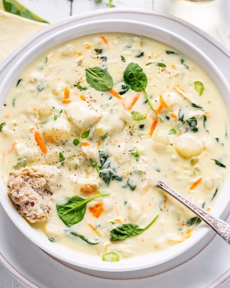 Куриный суп с картофельными клёцками 🍵 Ингредиенты: Куриные грудки без костей — 3–4 шт. Сельдерей — 1 стебель Лук репчатый — ½ шт. Чесночный порошок — 2 ч. л. Тимьян — 1 ч. л. Морковь — 1 шт. Оливковое масло — 1 ст. л. Куриный бульон — 1 л Соль, перец — по вкусу Картофельные ньокки — 450 г Молоко/сливки 10% — 500 мл Шпинат — 225 г Приготовление: 1. Куриные грудки обжариваем на среднем огне по 2–3 минуты с каждой стороны. Даём немного остыть и мелко нарезаем. 2. В большой кастрюле нагреваем оливковое масло на среднем огне. 3. Добавляем нарезанные кубиками сельдерей и морковь, мелко нарезанный лук, чеснок и обжариваем 2–3 минуты до прозрачности лука. 4. Добавляем курицу, куриный бульон, соль, перец, тимьян. Доводим до кипения. 5. Постепенно добавляем ньокки. Варим 3–4 минуты, затем убавляем огонь и продолжаем варить ещё минут 10. 6. Вливаем молоко или сливки. 7. Добавляем шпинат, перемешиваем и готовим суп ещё 1–2 минуты, пока шпинат не станет мягким. 8. Снимаем пробу, добавляем сол