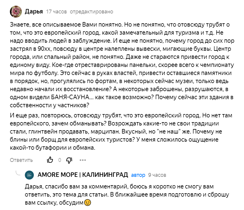 «Возрождать какие-то не свои традиции стали, глинтвейн продавать, марципан. Вкусный, но "не наш" же. Почему не блины или борщ для европейских туристов? У меня сложилось ощущение какой-то бутафории и обмана». Да, что вы прицепились к марципану. Вкусно, красиво. Не любите сладкое? И где вы видели европейских туристов? Ностальгический туризм в Калининградскую область прекратился еще в начале 2000х, не кому стало путешествовать. Последние годы только внутренний туризм. Ещё до коронавируса в область приезжали по большей части российские туристы. Чемпионат мира по футболу в 2018 году не в счёт.