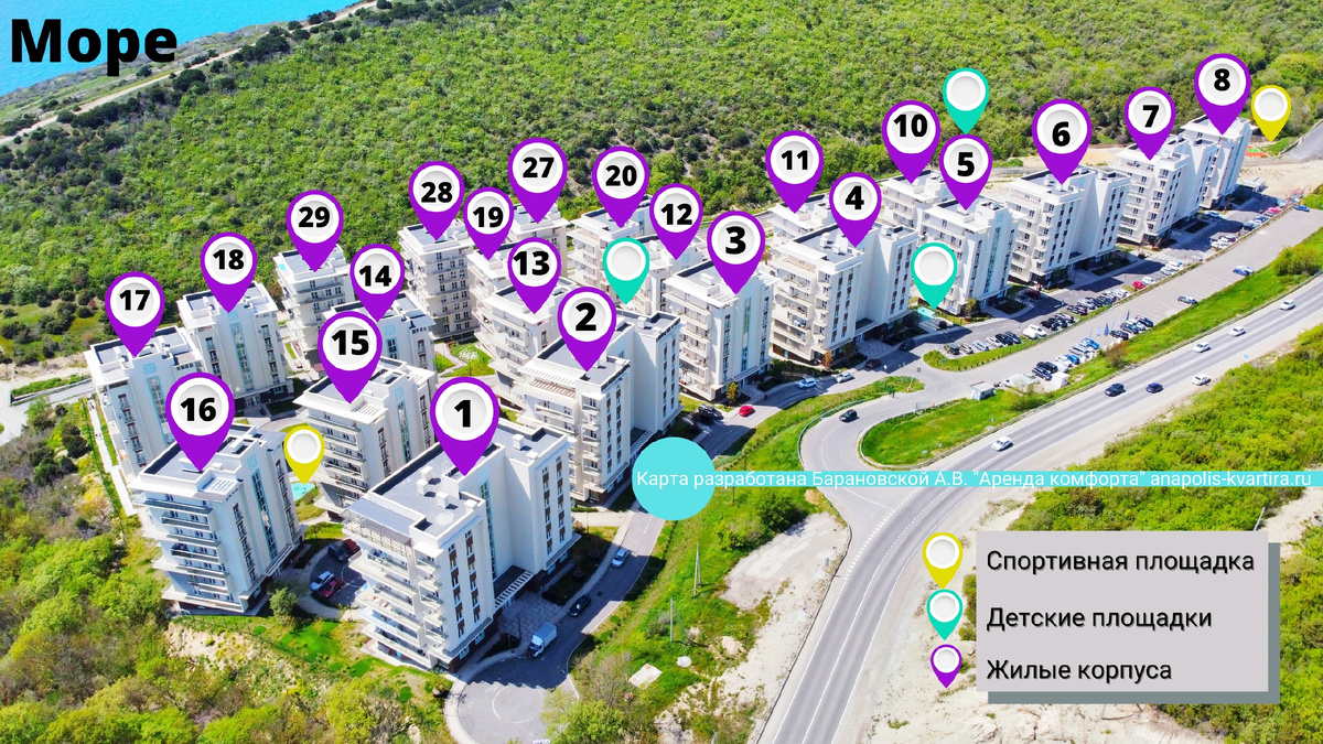 Новый жилой комплекс "Резиденция Анаполис" расположен в экологически чистом месте, вокруг можжевеловых лесов, высочайших гор в первой береговой линии черного моря. Ультра современные дома, высота которых 7-8 этажей. Море находится всего лишь в 350 метрах от комплекса, невысокие скалы окружают галечный пляж. ЖК располагается на первой пляжной линии тихого посёлка Варваровка. От Анапы в 10 км, от курортного поселка Сукко в 2 км. На самой территории комплекса есть всё самое комфортное для Вас и Ваших детей - безопасные дворы, мини детские площадки с мягким покрытием для большой безопасности. С радостью поможем Вам с выбором апартаментов для летнего отдыха Anapolis-kvartira.ru - забронируйте свое место под солнцем!