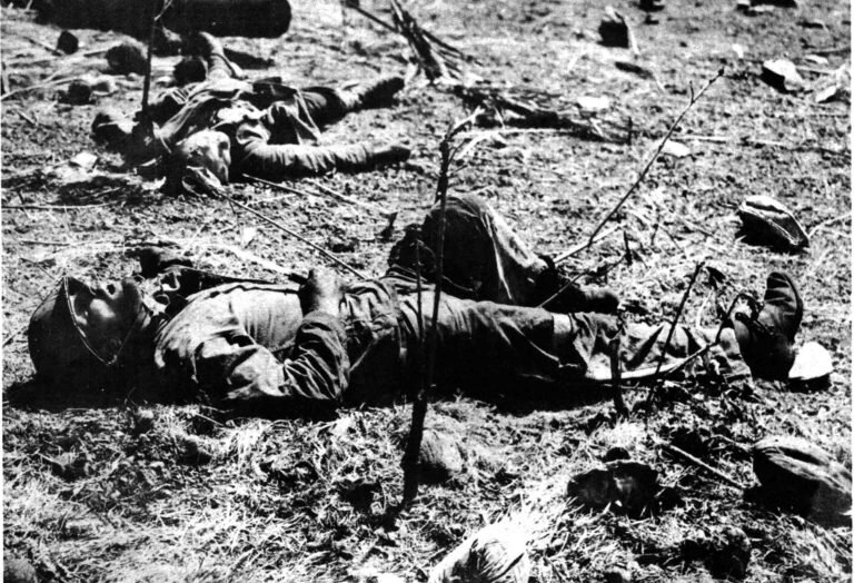 The US Marine squeezes in his hand a knife that killed a Japanese soldier in the background a moment before the sniper bullet struck him. Enewetok atoll, Engebi Island. February 1945.