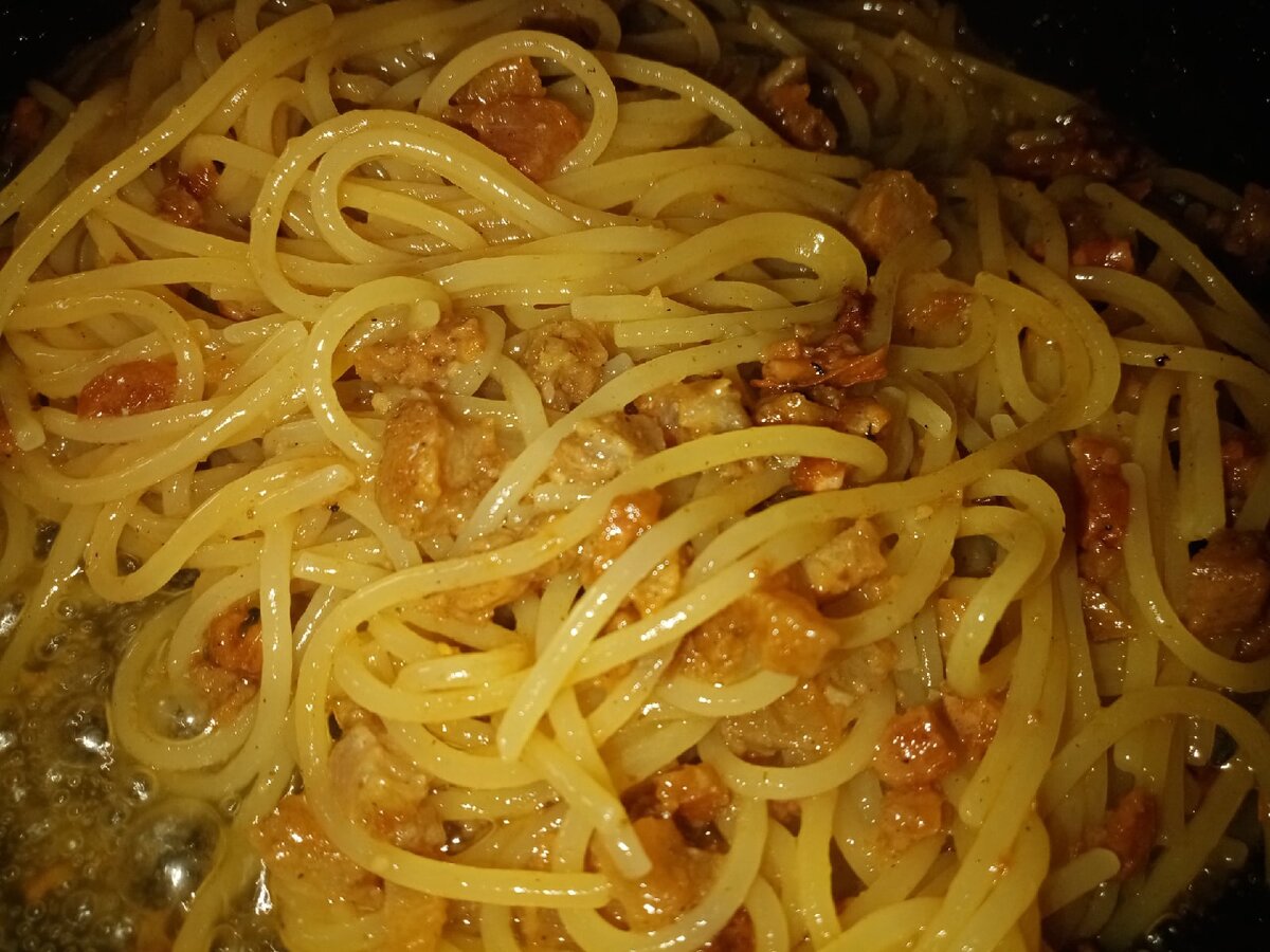 Не так давно мне попался на глаза рецепт "Карбонары" в исполнении Джейми Оливера. В наших условиях конечно такое приготовить не так просто, сомневаюсь что у кого-то завалялся в холодильнике сыр пекорино романо и гуанчале. У меня есть свой любимый рецепт этой пасты, но им я поделюсь в другой раз. Сегодня же -моя интерпретация пасты "Карбонара" от Джейми Оливера: Ставим на огонь кастрюлю с водой, ждем когда она закипит и отвариваем спагетти. В это время нарезаем бекон (или грудинку) небольшим кубиком. Ставим сковороду на огонь и на еще холодную сковороду отправляем бекон, чтобы успел вытопиться жир. Туда же отправляем раздавленный зубчик чеснока. В отдельной емкости взбиваем яйцо, добавляем к нему натертый на мелкой терке сыр, перемешиваем. Перец надо перемолоть, если нет специального приспособления, то можно положить перец в салфетку, взять скалку и "прокатать" перец. Затем можно высыпать в сито, жмых выкинуть, а сам свежемолотый перец добавить к обжарившемуся бекону(но не весь). Можно