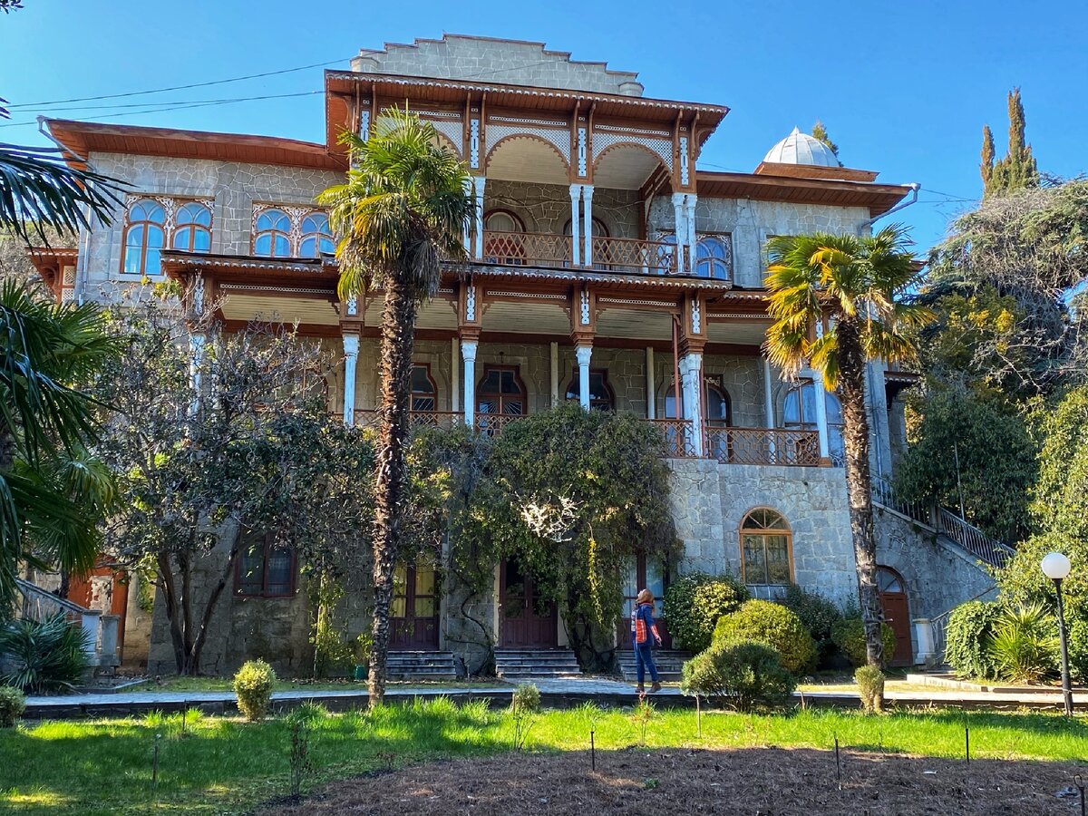Я впервые увидела ту виллу на фотографиях, и восхитилась тем, какая же она красивая! Кажется, что ты вообще не в Крыму, а за границей! Это строение - это старинная вилла Раевских, построена в мавританском стиле. Находится на территории санатория "Карасан". Перед поездкой я прочла, что по понедельникам и четвергам, по-моему, в определенные часы вход свободный. "Ну, значит, можно съездить туда погулять" ... Но - что-то пошло не так. Охранник сообщил нам, что вход на территорию закрыт, и они не пускают посетителей вообще - только тех, кто живет на этой территории. Просто так - сдаться? Ну уж нет! Ну, и как бывает, по старинной русской традиции, мы "договорились") Но - если поймают - то говорить, что мы сами сюда пробрались. Ну, ок. Пошли гулять. Территория, конечно, обалденная. Растет бамбук, ирисы... Подошли к вилле. Очень шикарное строение. Чувствуется загадочность и романтика. Вот - жили же люди! Но - потом нас засекли(( "Ребята, вы как сюда попали? Через сетку или забор пролезли?"
