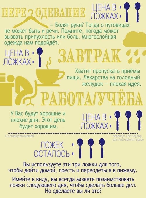 Я попросила ее сосчитать ее ложки. Она спросила зачем, и я объяснила, что когда ты здоров, ты думаешь, что у тебя есть неограниченный запас «ложек». Но когда тебе нужно планировать каждый день, тебе нужно точно знать, с каким количеством «ложек» ты его начинаешь. Это конечно не гарантирует, что ты не потеряешь еще несколько ложек позже, но, по крайней мере, это поможет понять, с чего начать. Она насчитала 12 ложек. Она рассмеялась и сказала, что хочет больше. Я сказала - нет, я заранее знала, как сработает эта маленькая игра, и когда она расстроилась, я сказала, что мы еще даже не начинали. Долгие годы я хотела больше «ложек», но так их и не получила, так что и она не получит. Я также сказала ей, что нужно всегда правильно осознавать, сколько их у нее, и никогда не выпускать их из рук, ведь она не должна забывать, что у нее красная волчанка.