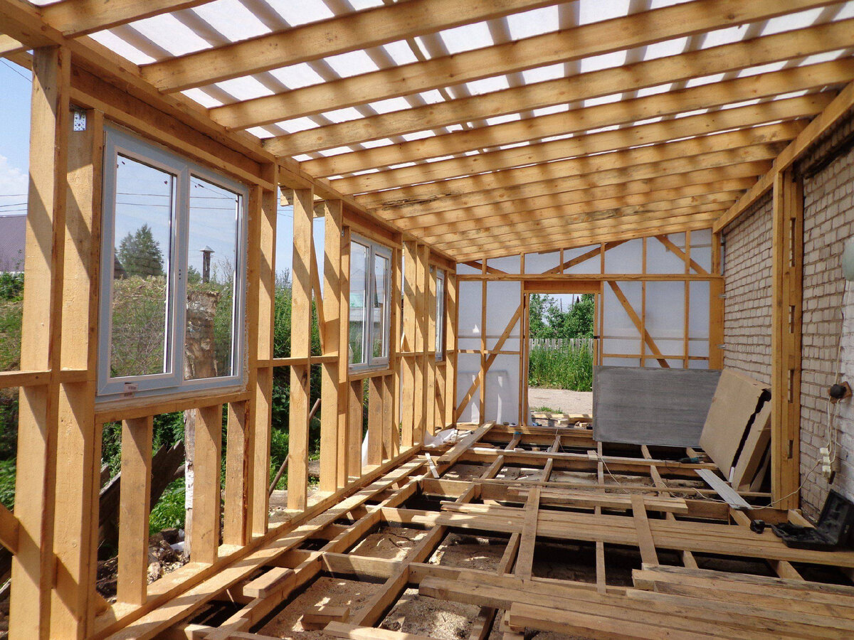 День девятый. Строительство галереи (веранды). Строим галерею шириной 1,5 м на всю ширину дома 6 м. Укладываем на верстак два бруса сечением 100 х 100 мм. На одном брусе (обвязка) через каждый метр делаем гнезда глубиной 20 мм под опорные балки сечением 100 х 100 мм. Выдалбливаем гнезда в обвязке, укладываем на цоколь дома и прибиваем гвоздями к нижней обвязке. На второй (верхней) обвязке длиной 6 м размечаем места опирания балок перекрытия с шагом 2 м и укладываем на фундаментные столбики (4 шт.), которые сооружаем на песчаной подушке глубиной 30 см. м помощью мерной рейки и уровня выводим вертикальную отметку валиков и укладываем на них обвязку поверх рубероида. Раскладываем по гнездам семь балок длиной 1500—1600 мм и крепим их гвоздями к обвязке. Чтобы исключить растрескивание пиломатериала и уменьшить трудоемкость пробивания гвоздей длиной 150—200 мм, под них предварительно просверливаем отверстия. Настилаем полы галереи (веранды). Если доски сухие, их прочно прибиваем. В противном