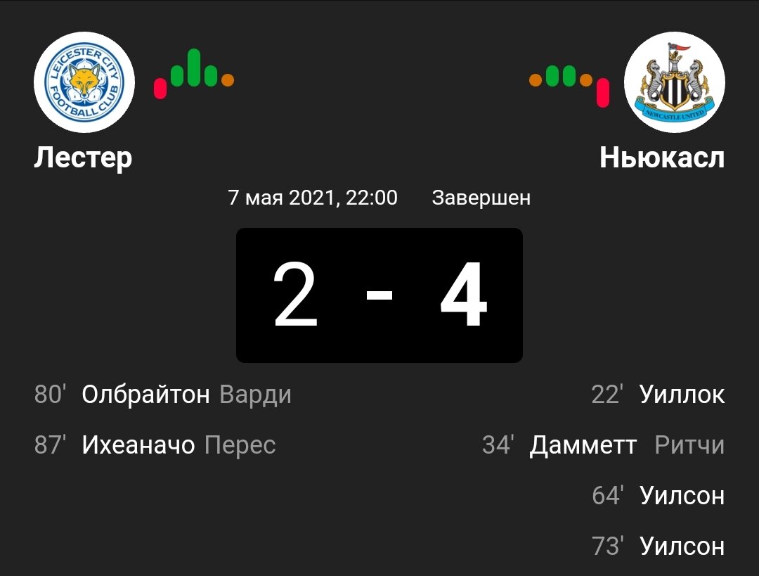 Лестер расслабился и пропустил по заслугам. Уже на 22-й минуте защитник хозяев играет очень невнимательно и как будто отдаёт пас гостям, Уиллок полузащитник Ньюкасла, принимает подарок хозяев и открывает счёт. Ньюкасл не заставляет долго ждать, Британский полузащитник Ритчи отлично навешивает с углового в штрафную зону хозяев и там одинокий "сталкер" Дамметт оформляет дуплетик. Уже ближе к 64-й минуте Лестер вновь ошибается, контратака от гостей приносит свои плоды видя гола, Кастань не поспевает за Уилсоном. Немного спогодя через 10 минуточек Ньюкасл засаживает 4-ую плюшку Лисам, Уилсон на добивании от штанги забирает себе дубль. Тут походу Лестеру надоело работать без чаевых, точным ударом Олбрайтон отправляет мяч в сетку гостей. Хозяевы проснулись после гола, не заставляют долго ждать забивает всё таки половину мячей, которых пропустили, Лестер долго спал, за 7 минут 2 гола, увы времени не хватает для отыгрыша, гости одерживают победу, а сони опять в спячку.