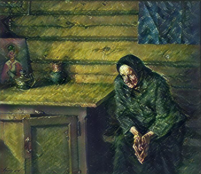 В ставшую родной деревню вернулся Яков в августе. Просёлочная дорога была пуста. Но повернув с лесной опушки в поле, увидел он у околицы знакомый силуэт… Такой вот - иссохшей, сгорбленной, седой, но светящейся от ничем не измеримого счастья - и запечатлел на портрете Яков свою Дусю во второй раз…