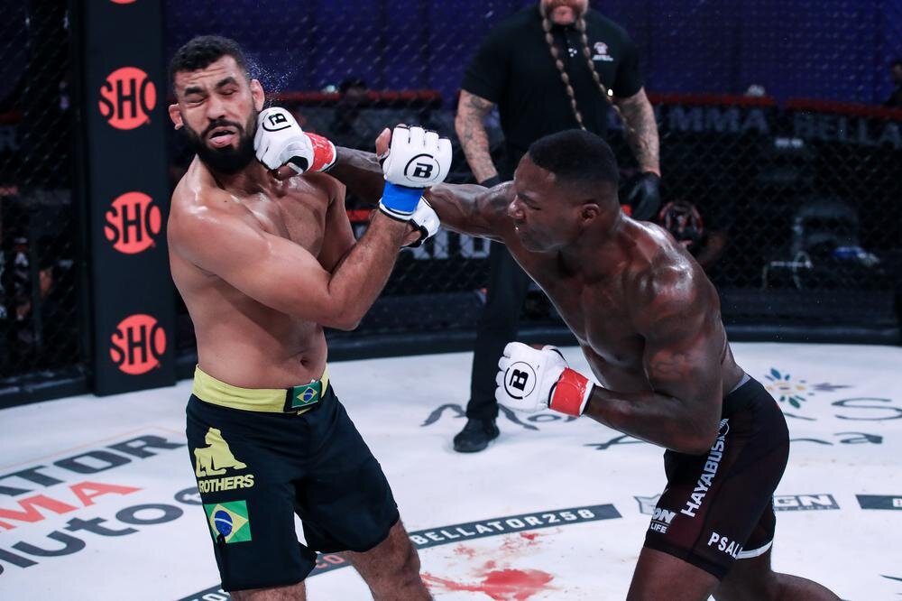 Утром 8 мая в соглавном событии турнира Bellator 258 прошел очередной четвертьфинал Гран-при полутяжеловесов: Энтони Джонсон сразился с Жозе Аугусто Азеведо. Изначально, в четвертьфинале Гран-при полутяжелой категории Bellator "Рамбл" Джонсон должен был драться с другим ветераном UFC Йоэлем Ромеро, но кубинец не прошел необходимого медицинского обследования перед боем из-за проблем с глазом. Джонсон – бывший двукратный претендент на титул UFC – свой последний бой провел четыре года назад на UFC 210, где проиграл сабмишном Дэниэлу Кормье в бое за чемпионство. В свою очередь, Аугусто Азеведо малоизвестен в широких кругах. Бразильский боец накануне рассматриваемого ивэнта имел рекорд в ММА 7-2 и провел в Bellator только один бой: 2 апреля на шоу Bellator 255 он выиграл "треугольником" в первом раунде у Джонатана Уилсона. Результат и ВИДЕО нокаута в поединке Энтони Джонсона и Жозе Аугусто Азеведо на Bellator 258: Итог боя: Энтони "Рамбл" Джонсон нокаутировал Жозе Аугусто Азеведо во втором