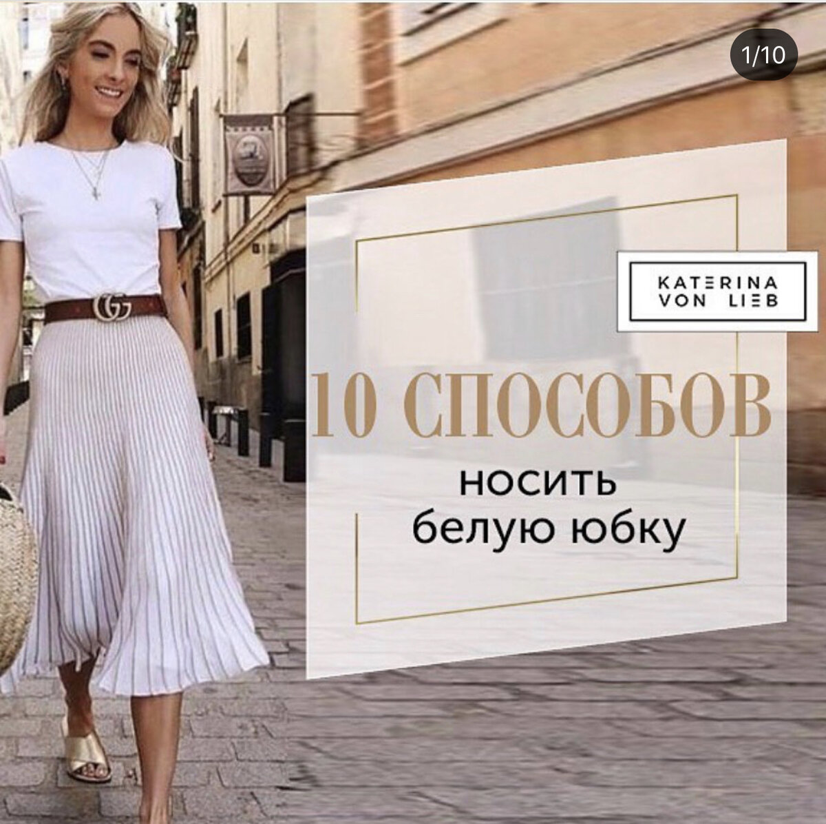 Привет, девушки. А вы боитесь носить белое? А если это юбка? ⠀ Ставьте ❤ и забирайте в закладки 10 фото идей, как носить белую юбку. Они настолько стильные, свежие и изящные, что возражение «испачкается быстро» улетучится. Жизнь слишком коротка, чтобы носить только те вещи, на которых не видно пятен😉 ⠀ ✔ Белая юбка плиссе + легкий джемпер. Не заправляем джемпер под юбку полностью, а только одну его сторону (чтобы создать стройнящую диагональ), либо элегантно оставляем на поясе. Рукава лучше засучить, мягко сборив и открыв запястья. Такой образ можно носить в бархатный сезон👌 Главное использовать правильную сумку: летом — из рафии, деревянную или соломенную, осенью — маленькую кожаную нюдового оттенка. ⠀ ✔ Пышная юбка-миди поможет подчеркнуть пропорции тела, смоделировав силуэт песочные часы ⏳ Талия становится более выраженной, когда есть равновесие между плечами (здесь отделка рукавов) и зоной ног (расклешенный фасон юбки). ❗Этот образ не будет смотреться, если длина юбки б