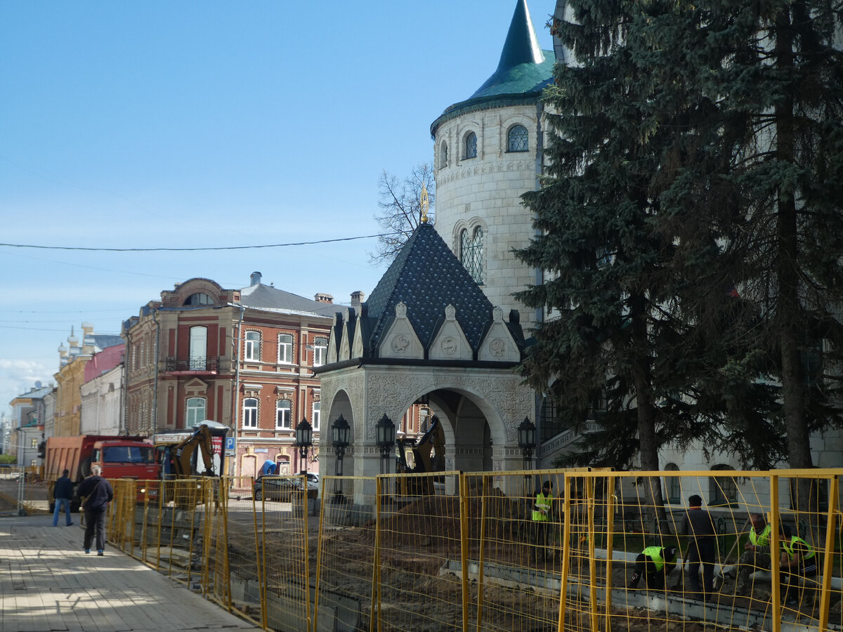 В Нижнем Новгороде я хотела побывать довольно давно, и вот на последних майских праздниках наконец доехала. Поезд из Москвы прибыл поздно вечером, так что — такси, отель, кровать. Ну а утром мы были готовы к знакомству с купеческой столицей России! Перед поездкой в Нижний мы заранее договорились с местным гидом об индивидуальной экскурсии, и он назначил нам встречу на крыльце Государственного банка на Большой Покровской улице. Однако что-то пошло не так, и там нас встречала вот такая милая картина — листайте галерею: Красивая Большая Покровская перекопана. Подойти к памятникам модерна и рассмотреть их вблизи практически невозможно. Правда, подоспевший гид сразу же нам объяснил (в этот момент мы уворачивались от экскаватора), что всё дело в подготовке к празднованию 800-летнего юбилея Нижнего Новгорода — город собирается отмечать день рождения, и мы попали в разгар приготовлений. К слову, приготовления действительно грандиозные: по всему городу развешены флаги с числом "800", а на знам