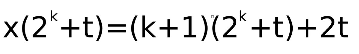 Условие: Есть последовательность заданная x(1)=1 и следующей рекуррентной формулой: Напомню что рекуррентная формула- это формула по которой из известных членов последовательности можно посчитать следующий. Найдите x(2017). Решение: Исследовав функции y(n)=x(n)-n и x(n) находим явный вид последовательности: Найдем максимальную степень двойки k, что она меньше n, тогда: Докажем что это явный вид. Для начала проверим n=1 Теперь проверим что выполняется рекуррентная формула Следовательно мы узнали явный вид, значит посчитать какой-нибудь член последовательности не проблема. Ответ: x(2017)=24225