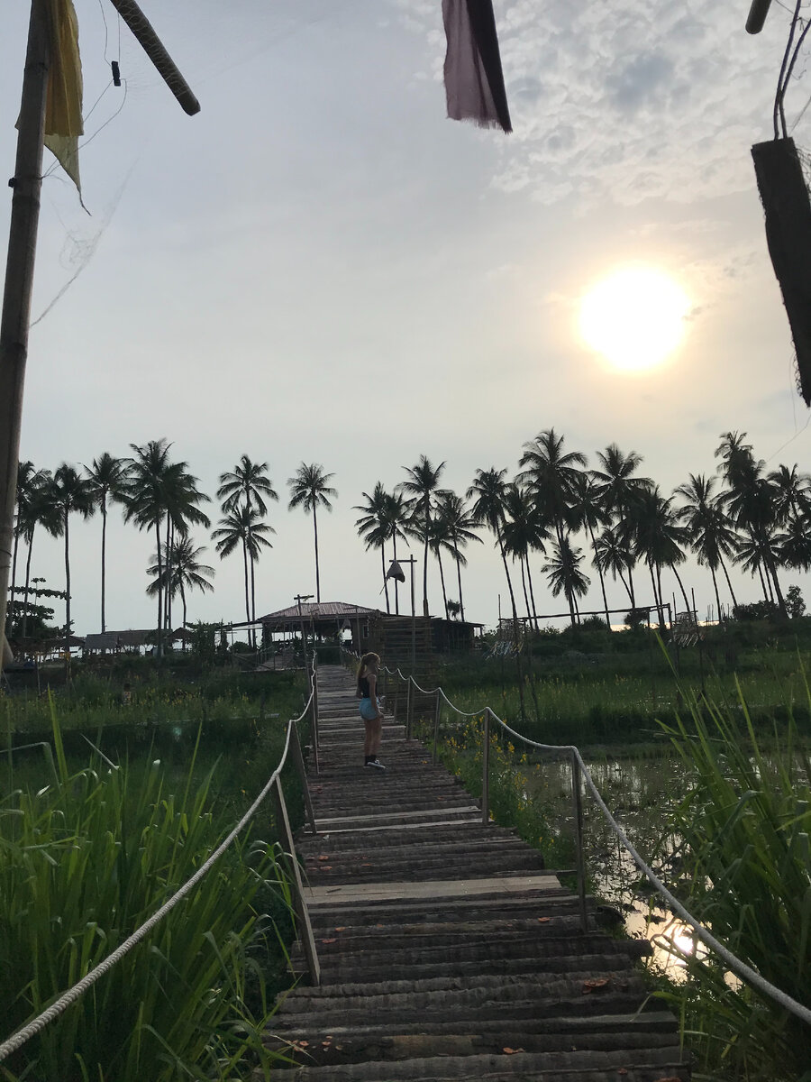 Раньше это было маленькое пляжное кафе, даже, скорее, бар. Это юг острова Самуи, не самое туристическое место. А сейчас, во времена ковида, здесь совсем пустынно и безлюдно. Заглядывают сюда только живущие неподалеку иностранцы и, наверное, местные. Но именно в ковидное время хозяева начали облагораживать территорию, даже некое подобие ландшафтного дизайна проглядывают. С противоположной стороны от моря раскинулось озеро с лотосами: Про лотосы подробнее, про их символизм и важность для Азии, я писала здесь. Это непередаваемо красиво, когда они цветут и за розовым цветом не видно воды: А вот так выглядит расширение территории, все из природных материалов, такой тропический дизайн: Растения разрастутся очень быстро и со временем, примерно через пару месяцев, думаю, выглядеть все будет зеленее и красивее: Сделали несколько фотозон даже: Поскольку это самая закатная сторона острова, то как раз на таких зонах можно фоткаться на фоне красок заходящего солнца. А это гигантский "арт-объект" с