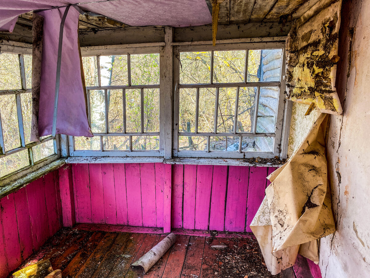 Этот заброшенный дом мы нашли в глухой деревне, где проживает многодетная семья. Вместе с главой семьи, Сергеем, мы отправились прогуляться по деревне и на самом ее краю этот дом мы и увидели. Дверь его была открыта настежь, часть стены частично начала рушиться. Мы решили заглянуть внутрь и посмотреть, что там сохранилось от прошлого. Осматривать заброшку мы начали с деревянной террасы. Стекла на окнах там вроде бы были целые, но вот обои, которыми в террасе были оклеены стены, начали постепенно обваливаться клочьями. Наверное, от попадания сырости. Обваливали обои и с потолка. Скорее всего, крыша террасы пропускает воду. И, наверняка, вся уже прогнила. Хоть эта терраса пока еще и стоит, но не сегодня, так завтра, она начнет постепенно рушиться. Под потолком террасы висела кепка-бейсболка. Когда-то она принадлежала кому-то из жителей дома. Сейчас же от сырости она просто покрылась пятнами плесени. На подоконнике террасы лежал вот такой предмет. Я долгое время не мог понять, что это так