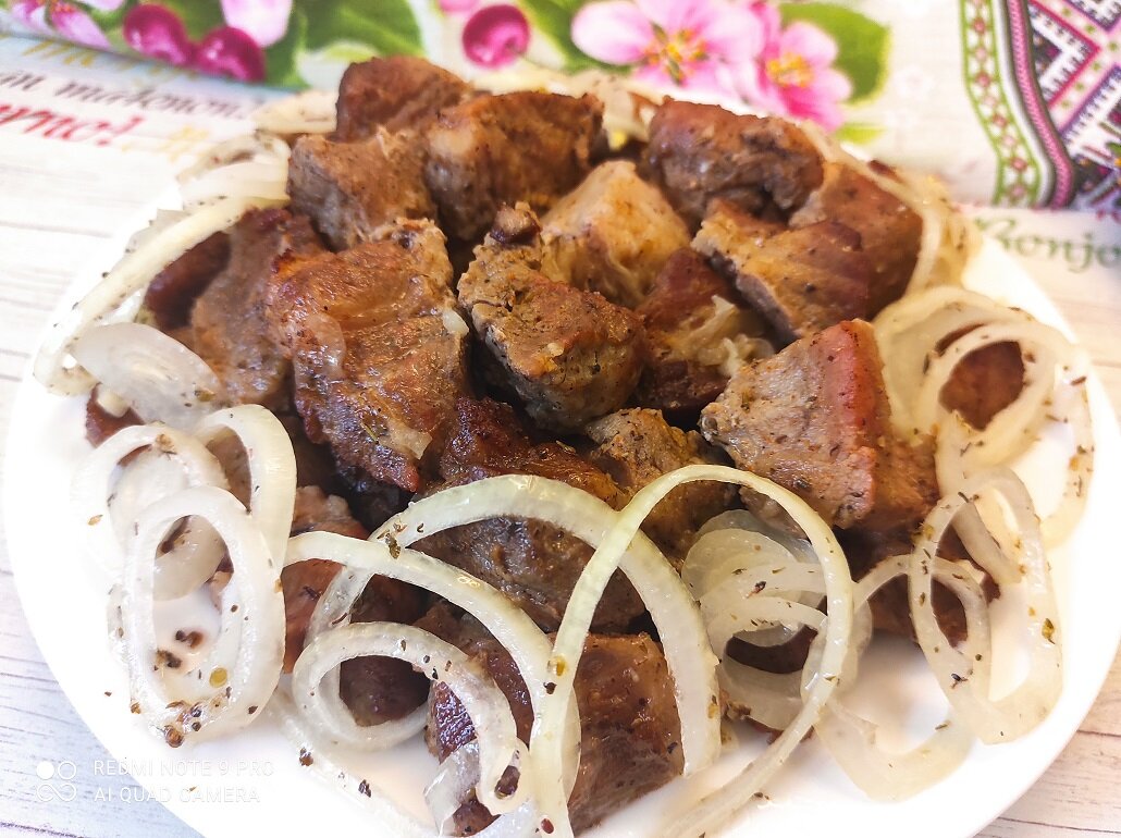 Маринованный лук под мясными кусочками делает шашлык сочным и ароматным. Блюдо получается как с мангала! При этом вам не нужно даже выходить из дома, чтобы его приготовить.