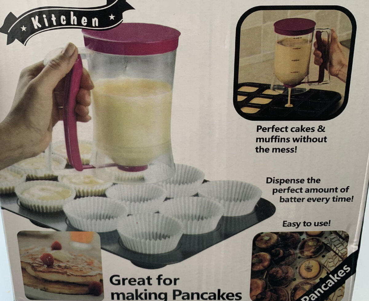 Диспенсер предназначен специально для дозирования жидкого теста в формы для выпечки или на сковородку.