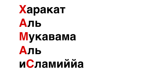 На русский язык это переводится как "Исламское движение сопротивления". При этом, наблюдательный читатель заметит, что в последнем слове взята не первая буква (И), а вторая (С).