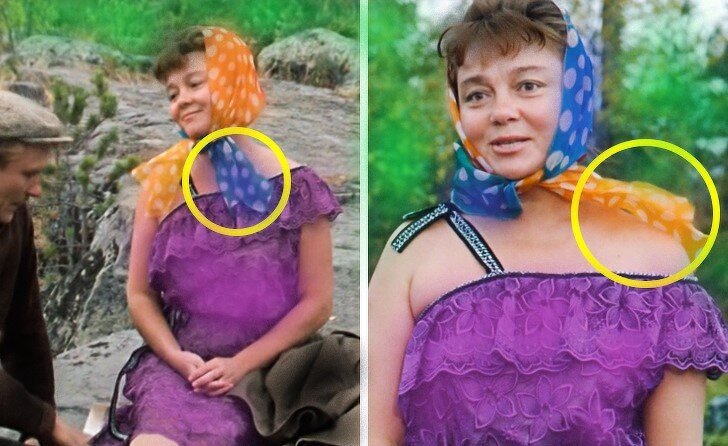 16. Лида вытащила Шурика из воды в полосатой футболке, затем она вешает ее на веревку для просушки, но, как видите, в следующей сцене она снимается в кофточке белого цвета.