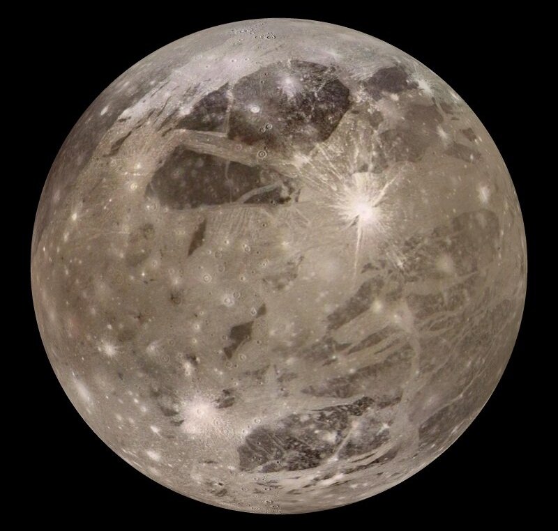 Солнечная система насчитывает более 200 планетарных спутников и более 600 прочих, но самым крупным из них считается Ганимед. Так получилось, что законы «симметрии» тут отработали, как следовало, и самая большая планета — Юпитер, получила самый большой спутник. И хотя в массе Ганимед сильно уступает наименьшей из планет системы — Меркурию, но вот диаметром его превосходит на 8%. Чуть предыстории. Ганимед был открыт Галилеем ещё в начале XVII века(1610) при помощи примитивного, им же созданного, телескопа, позволяющего получить лишь небольшое увеличение наблюдаемого космического тела. С тех пор инструменты были серьёзно усовершенствованы и мы можем своими глазами увидеть настоящие фото Ганимеда. Фото Ганимеда. National Oceanic and Atmospheric Administration, Public domain, через Викисклад Если проводить сравнения дальше, то Ганимед имеет размеры в 41% от радиуса Земли, крупнее второго спутника в системе — Титана на 2%, примерно вполовину тяжелее Луны и в 1,51 раза крупнее по диаметру.