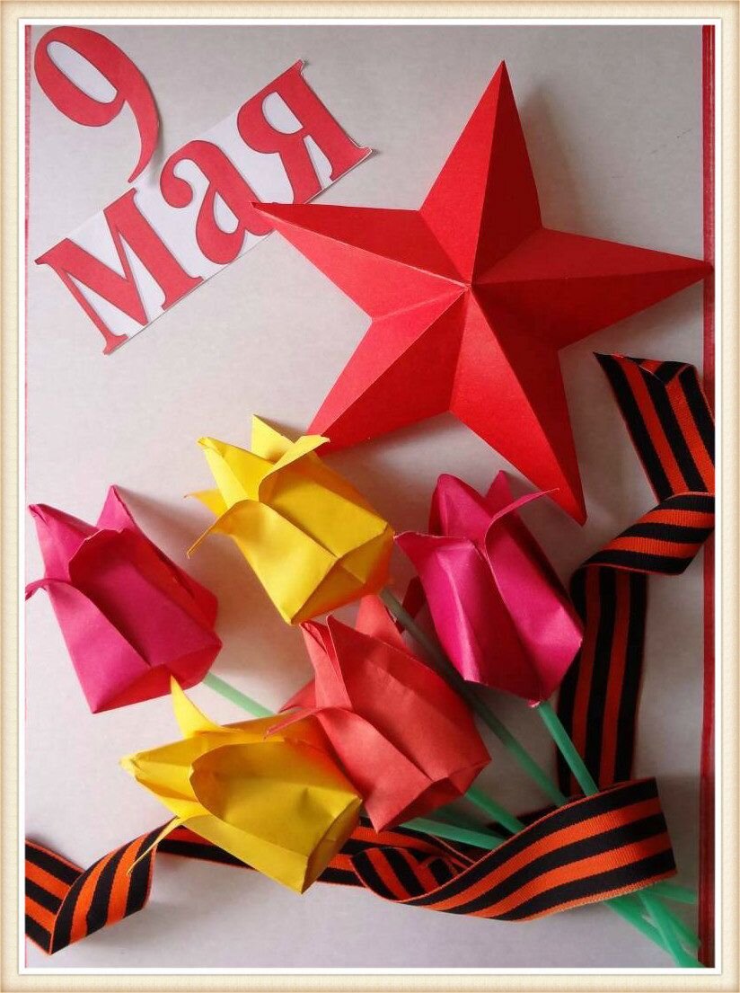 Поделки из бумаги и картона Основной материал, из которого можно сделать красивые поделки к 9 мая – бумага. Цветные листы, картон – все это точно найдется на домашнем столе дошкольника. Наибольшей популярностью среди поделок ко дню Победы, выполняемых детьми дошкольного возраста, пользуются голуби мира. Их просто изготовить самостоятельно. Как сделать голубя из бумаги: Мастер-класс «Голубь мира из салфеток» Сделать бумажного голубя можно практически из любых подручных средств. Пригодиться могут и обычные одноразовые салфетки. Для этого понадобится клей ПВА, салфетки и лист А4 (можно использовать картон или обычную бумагу). Алгоритм действий достаточно прост: Таким образом можно получить объемную фигуру, которая выглядит естественно и привлекательно. С помощью данной техники оформить можно и другие композиции или открытки. Также хорошо получаются у дошкольников подделки в виде открыток, на которые приклеены цветы. Такая композиция может быть полностью бумажной. Главное – оригинально
