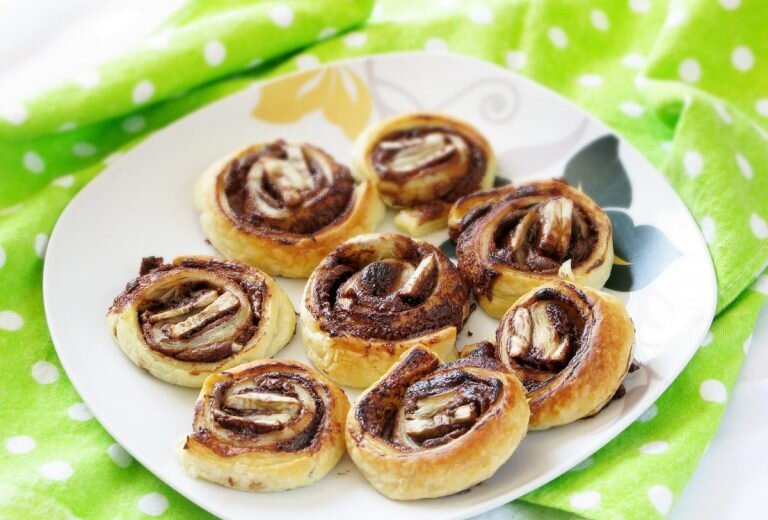 ФРАНЦУЗСКАЯ ВЫПЕЧКА С НУТЕЛЛОЙ И БАНАНОМ Это другой вид улиток из слоеного теста - экспресс-кофейный десерт. Французская выпечка с нутеллой и бананом - это простая и быстрая закуска, особенно когда у нас нет времени, или когда нам не хочется работать на кухне, или когда нас удивляют неожиданные гости. Я полагаю, что всегда неплохо иметь лист слоеного теста в холодильнике или морозильной камере. Он всегда пригодится, будь то сладкое на десерт или как приправленная ветчиной и сыром закуска. Ингредиенты: - 1 лист слоеного теста - ½ банки крема Nutella - 1 спелый банан КАК ПРИГОТОВИТЬ СЛОЕНОЕ ТЕСТО С НУТЕЛЛОЙ И БАНАНОМ? Смажьте лист слоеного теста кремом Nutelli. Банан нарезать тонкими ломтиками и выложить в два ряда в центре торта по длинной стороне. Плотно скатайте слоеное тесто в рулет. Нарезать порциями (улиток) толщиной 2 см. Слоеное тесто выложить горизонтально на противень, застеленный бумагой для выпечки, с интервалом 2-3 см. Выпекайте печенье примерно 15-20 минут в разогрет
