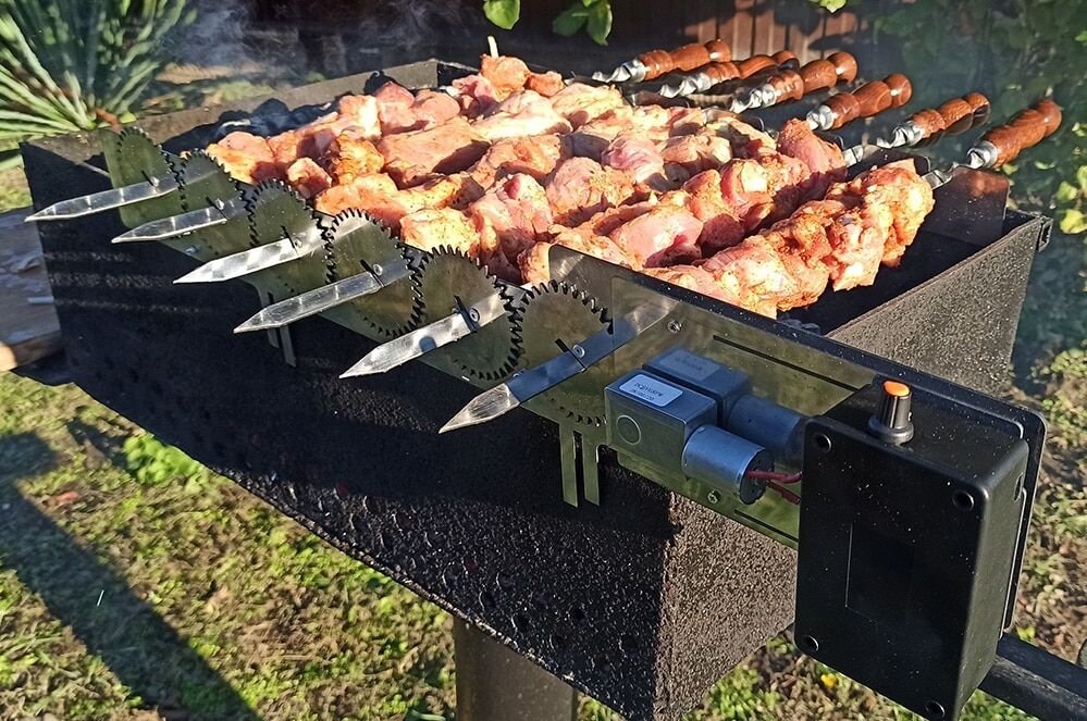 Устройство изготовлено из нержавеющей стали (в том числе мотор и шестерни) и легко крепится прямо к мангалу, а затем при помощи батареек или пауэрбанка (есть microUSB) автоматически поворачивает шампуры с мясом на скорости от 1 до 4 оборотов в минуту.