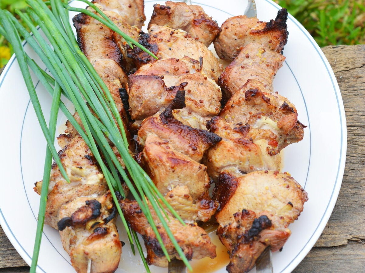 Ингредиенты: Нарезаем мясо средними кускам. На 2 килограмма мяса добавляете 100-150 граммов французской горчицы и специи. Соль добавляем только перед нанизыванием на шампур. Приятного вам аппетита!