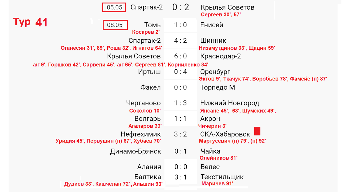 Крылья Советов выиграли сезон 2020 / 2021 года. Случилось это в перенесенной игре 35 тура со Спартаком – 2. Иван Сергеев оформил дубль и обновил рекорд ФНЛ по числу голов. В 41 туре Томь – Енисей 1:0. Томь набирает очки в 9 из 10 последних турах и в шаге от спасения. Спартак – 2 – Шинник 4:2. Москвичи прервали серию из 4-х поражений. 19-летний Степан Оганесян записал 2 гола и 1 передачу. Безвыигрышная серия Шинника длится с ноября (полгода). Новоиспеченный победитель турнира Крылья Советов громит Краснодар -2 со счетом 6:0. Будущий игрок сборной России Иван Сергеев забивает в 5-м туре кряду, а самарцы продлевают отрезок до 19 игр без поражений. Иртыш – Оренбург 0:4. Дмитрий Воробьев отмечается в 4-й игре подряд и выводит свой клуб в РПЛ. У Оренбурга – 7 побед. У омского Иртыша – 6 поражений. Факел – Торпедо 0:0. Факел имеет на данный момент 2 победы и 2 ничьи, а от торпедовцев уплывает повышение. Более того, клуб из Воронежа в 13-й раз заканчивает вничью, это больше всех. Чертаново – Н