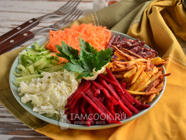 Салатик яркий, ароматный. Еще его называют в интернете "французским". ????? Я встретила этот рецепт под названием "узбекский", понравился состав, потому - готовлю! Хотя, признаюсь, при слове "узбекский" больше вспоминается, редька, мясо и т. д, ну вы понимаете. Нам понадобится: 2 средних свеколки 2 картофелины крупных 2 средних свежих огурца 2 средних ядреных моркови чеснок Говядина или копченая колбаса - 200 гр. 3 яйца вкрутую майонез, соль, перец. Последовательность: Все измельченные продукты собираем в большую чашку, кроме картофеля. Картофель натереть на терке для моркови по - корейски, промыть, откинуть на дуршлаг, обжарить на растительном масле. Получаем картофель - пай. Он идет сверху на салат - для украшения, его не кладем в общую массу. Кстати, можно купить картофельные чипсы в форме соломки, такие продаются, не придется самому жарить картофель! Свёклу сварить, охладить, нарезать соломкой или на крупной терке. Морковь натереть на корейской терке, в нее пару долек чеснока и пр