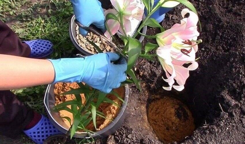 Для посадки луковиц в грунт вам понадобится емкость для высадки или какое-то плоское возвышение. В качестве емкости можете использовать невысокие тазики для измельчения, старые ведра или даже старую ванну. Выбрав подходящую емкость, положите в нее 2/3 емкости древесной золой. Золу полезно поменять через 2-3 недели, добавив толченый суперфосфат, калийную соль или костную муку. Толченые камешки также очень полезны. Затем опустите луковицы в посадочную смесь. Я использую исключительно смесь для орхидей, оставшуюся от покупки. В неё добавляю глину, которую разбавляю водой 1:1. Хотя и глину можно заменить землей, но тогда раствор необходимо будет развести немного водой. Чтобы лилии лучше укоренились, оставьте луковицы на 3 дня в емкости, где разведена земля, но при этом не поливайте растения. Потом установите горшок на возвышении, не касаясь грунта. Поливать лучше в вечернее время, используя дождевую или талую воду. Так вам удастся избежать заражения луковиц лишайниками. В таких усл
