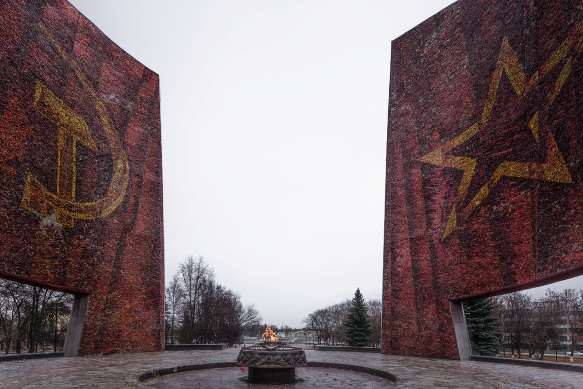 Первый из них находится в Нижнем Новгороде, который я посещал с другом в ноябре прошлого года. Наткнулись мы на него совершенно случайно, катаясь по городу в поисках советских мозаик. Напротив цехов Горьковского автомобильного завода раскинулся большой сквер, в центре которого установлен мемориал Славы с вечным огнём.
