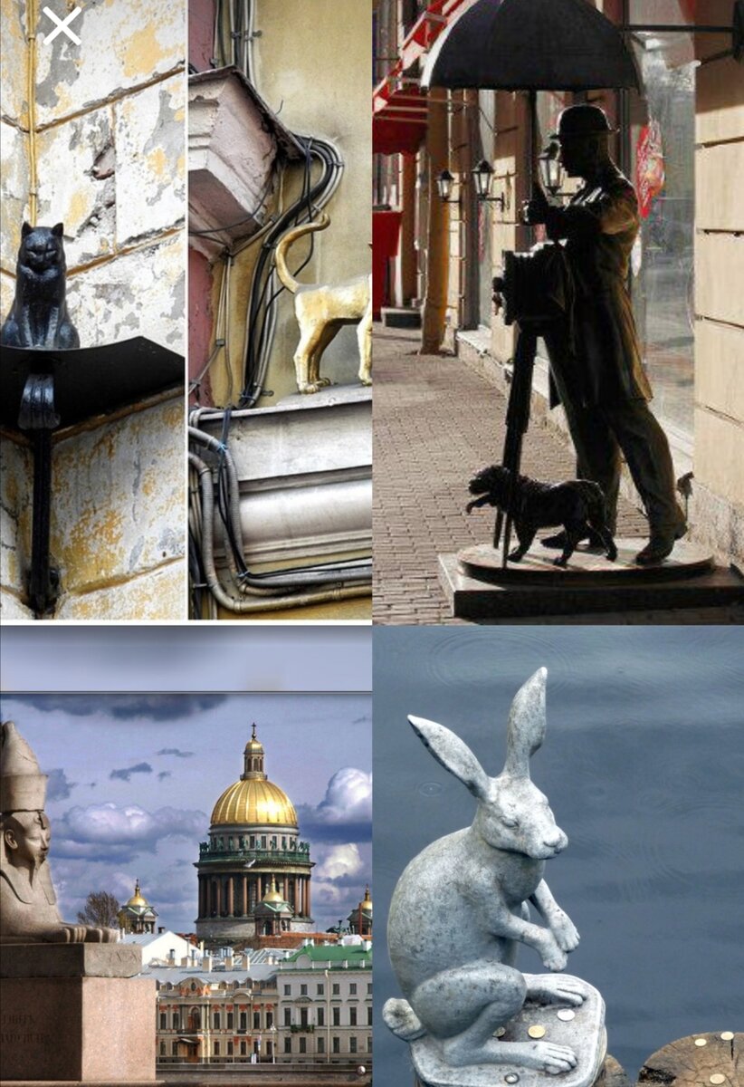 Кот Елисей и кошка Василиса сидят на высоте второго этажа на Малой Садовой улице. Попадёте монеткой на постамент, желание сбудется. "Петербургский фотограф" на Малой Садовой улице. Нужно взять фотографа под локоток. А для того, чтобы не переводились деньги надо подержаться за его мизинец. Берег возле Академии художеств охраняют сфинксы. Им три с половиной тысячи лет. Они содействуют выполнению желания. Рядом с ними сидят грифоны. Гладим грифона по голове, другой рукой-держим за правый зуб. Одновременно смотрим в глаза ближайшему сфинксу. На одной из свай Иоанновского моста, ведущего к Петропавловской крепости, есть скульптура "Зайчик, спасшийся от наводнения". На его постамент кидают денежку взамен на заветное желание. Продолжение мест, приносящих удачу, в следующей статье.