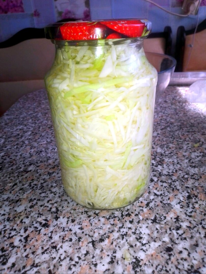 Этот рецепт удобен тем, что приготовив эту капусту и поставив в холодильник, вы несколько дней не будете задумываться о том, какой салат приготовить к обеду или ужину. Изменяя добавки у вас каждый раз на столе будет новое блюдо. Ингредиенты: Капусту тонко нашинковать. Сложить в дуршлаг. Обдать один раз кипятком, а потом холодной водой. Отжать. Приготовить маринад. Полтора стакана воды вскипятить с 0,5 ст. л. соли и 1 ст. л. сахара. Добавить черный перец горошком и душистый перец и по желанию 1 гвоздику. Маринад снять с огня и выжать туда половину лимон или добавить 1 ст. л. уксуса. Попробуйте, может быть на ваш вкус нужно добавить еще соли и сахара. Капусту сложить в банку. Залить горячим маринадом, умять ложкой, чтобы вся капуста ушла в маринад. Оставьте до полного остывания. Капуста уже готова к употреблению. Если вы будете подавать на стол сразу, то подавайте прямо в маринаде, если простояла уже 2-3 дня в холодильнике, слегка отожмите ложкой. Вариантов подачи этого салата множество.
