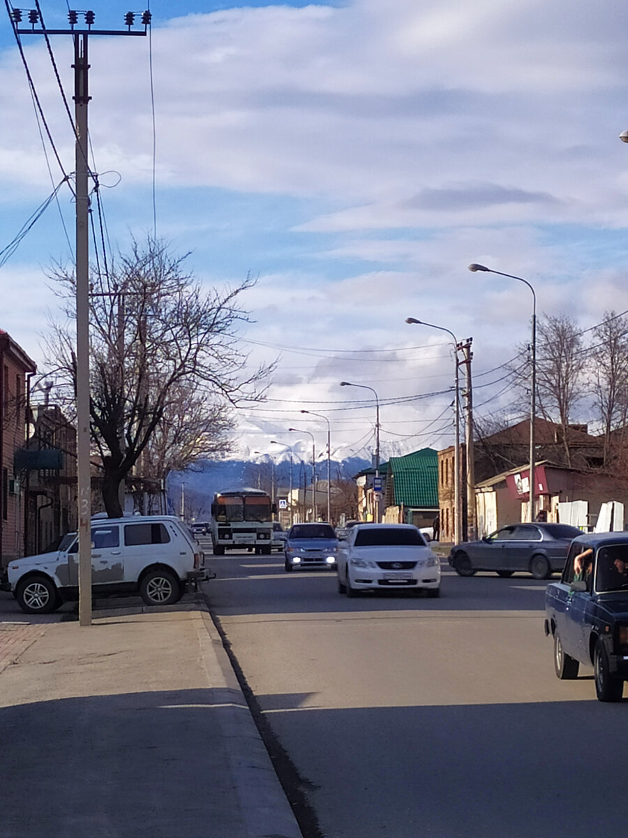 Въехав в Цхинвал со стороны Транскама, мы оказались на главной улице города. Если смотреть назад, были видны горы, с которых мы только что спустились. И здесь, в солнечной долине, казалось невероятным, что полчаса назад мы продирались сквозь снегопад и лавины.